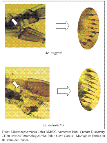 Fig. 1. Estructura y distribución de 7 a 12 escamas del peine del octavo segmento abdominal entre Aedes aegypti y Aedes albopictus.