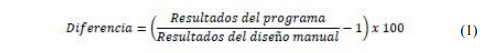 Para validar los resultados obtenidos con el programa creado se realizó el diseño de una conexión tipo Simpson Strong-Tie Strong Frame de manera manual. La diferencia porcentual entre los resultados obtenidos se calculó mediante la siguiente ecuación utilizada en distintas investigaciones (5), (6), (7) y (8):