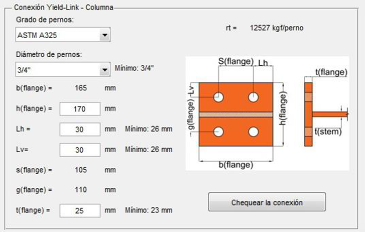 Luego se diseña la conexión entre el alma de la pieza Yield-Link y el ala de la viga. Inicialmente se elige el grado de pernos y diámetro. El programa calcula automáticamente el número de pernos requeridos para soportar la fuerza axial. Seguidamente se ingresan los datos de 𝑠𝑐, 𝑠𝑠𝑡𝑒𝑚, 𝑠𝑏 y ℎ, y con esto el programa calcula y muestra los valores de 𝐿𝑏𝑚−𝑠𝑖𝑑𝑒 y 𝑔𝑠𝑡𝑒𝑚. Una vez ingresados todos los valores, se hace clic en el botón “Chequear la conexión” para verificar que el alma de la pieza Yield-Link y el ala de la viga tienen la resistencia suficiente para soportar la fuerza de diseño 𝑃𝑟−𝑙𝑖𝑛𝑘. Se ve que todos los controles cumplen.