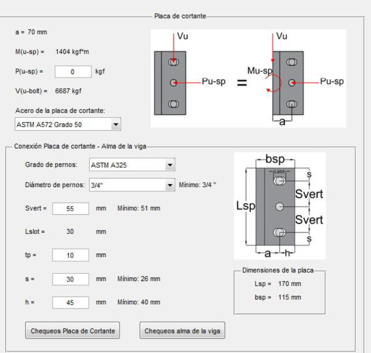 Se selecciona el mismo tipo de acero ASTM A572 Grado 50, el grado de pernos y su diámetro. Aquí también el programa muestra el mínimo diámetro requerido para soportar la fuerza de diseño, en este caso la fuerza cortante 𝑉𝑢−𝑏𝑜𝑙𝑡. Se ingresa el valor de 𝑠𝑣𝑒𝑟𝑡 y el programa calcula el tamaño de la ranura horizontal para los pernos superior e inferior de la placa. Se finaliza el diseño de esta parte de la conexión especificando el espesor de la placa y las distancias al borde vertical y horizontal (ver Figura 13). Con todos los datos anteriores suministrados, se habilitan los botones “Chequeos Placa de cortante” y “Chequeos alma de la viga”. Se hace clic en cada uno de ellos para visualizar las resistencias de la conexión para cada uno de los estados límite que se deben estudiar para cumplir con lo requerido en el procedimiento de diseño de la norma AISC 358-16.