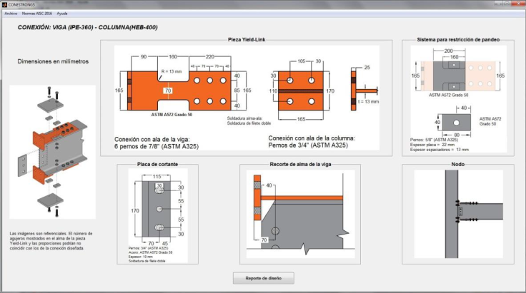 El programa diseñado llamado CONESTRONG, guía al usuario durante el proceso de diseño de la conexión, suministrando información sobre las distintas limitaciones normativas y realizando los chequeos requeridos en cada una de las partes que la conforman. El software permite diseñar la conexión mediante el ingreso de los datos en las distintas interfaces y visualizar los resultados tanto gráficamente como a través de un reporte que muestra toda la información del diseño definitivo y los chequeos realizados durante el proceso.