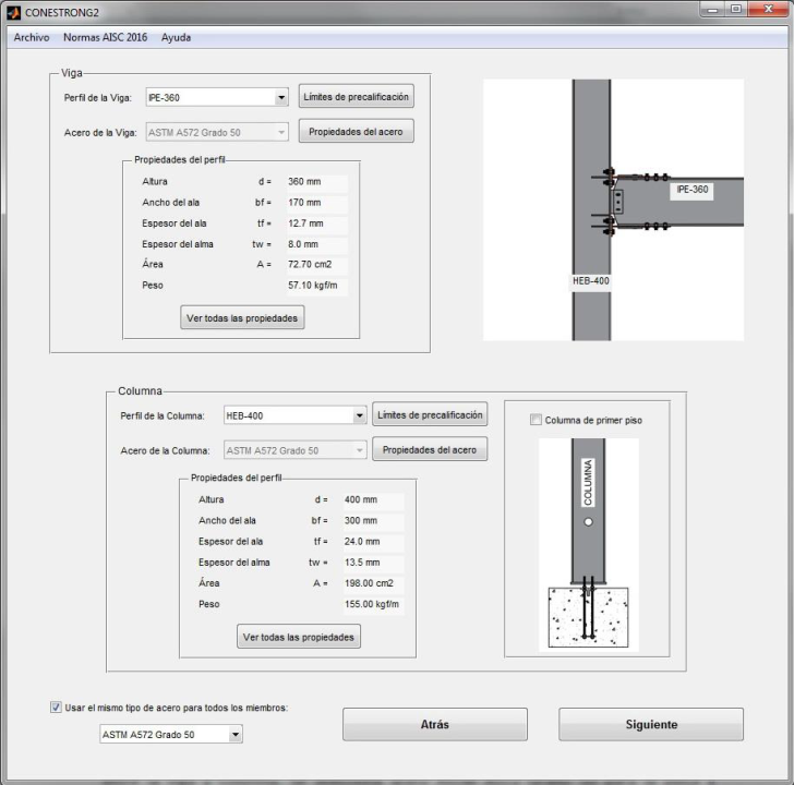 Se inicia el diseño seleccionando la opción de nodo de borde en la primera interfaz para luego especificar los perfiles y materiales de los miembros. Se selecciona IPE-360 para la viga y HEB-400 para la columna, y acero ASTM A572 Grado 50 para los dos miembros, visualizado en la segunda interfaz (ver Figura 8).
