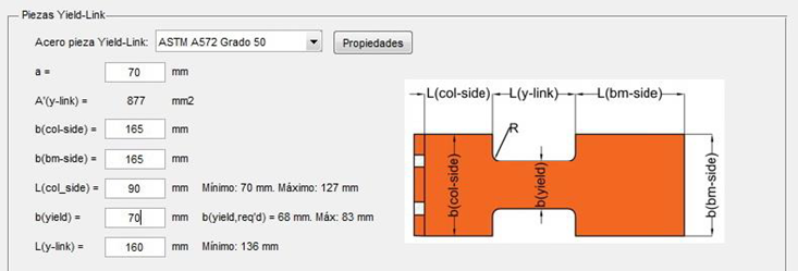 En la tercera interfaz se introduce inicialmente el momento último de diseño de la conexión (𝑀𝑢) y las cargas uniformemente distribuidas que actúan en la viga. Seguidamente se inicia el diseño de la pieza Yield-Link. Se selecciona acero ASTM A572 Grado 50 para la pieza. Se continúa el diseño ingresando los valores para 𝑎, 𝑏𝑐𝑜𝑙−𝑠𝑖𝑑𝑒, 𝑏𝑏𝑚−𝑠𝑖𝑑𝑒, 𝐿𝑐𝑜𝑙−𝑠𝑖𝑑𝑒, 𝑏𝑦𝑖𝑒𝑙𝑑 y 𝐿𝑦−𝑙𝑖𝑛𝑘 (ver Figura 9).