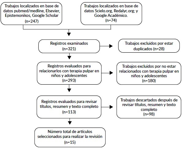 Artículos en idioma inglés y español, publicados desde enero 2017 a junio de 2022 de ensayos clínicos aleatorios, estudios observacionales, informes de casos y guías de prácticas clínicas que informen o aporten datos sobre la efectividad de la técnica manual o rotatoria para realizar terapias pulpares en odontopediatría.