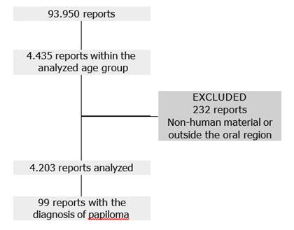 Following the exclusion and selection process (Figure 1), 99 reports with a diagnosis of papilloma were included in the descriptive analysis, representing 2.3% of the total reports.