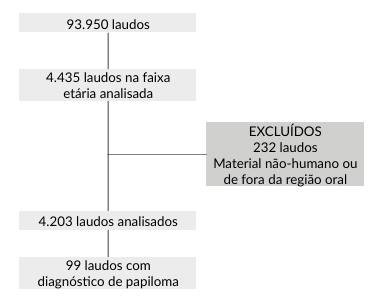 Após o processo de exclusão e seleção (Figura 1), 99 laudos com diagnóstico de papiloma foram incluídos na análise descritiva, correspondendo a 2,3% dos laudos totais.