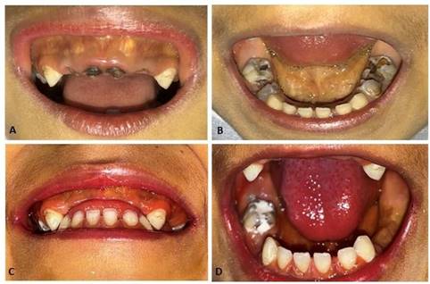 Figuras 1 A) Visão intraoral: Observa-se icterícia na mucosa; restos radiculares dos incisivos superiores centrais e laterais; mancha branca ativa (cárie) nos caninos superiores; B) Observa-se icterícia na região de assoalho de boca; lesões de cárie extensas nos molares inferiores direito e esquerdo; C e D) Visão intraoral após a conclusão do tratamento dentário proposto: mucosa ictérica; excelente reparação dos tecidos nas regiões das extrações; melhoria na higiene oral.