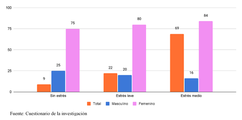 Se obtiene el nivel de estrés, según Test de estrés laboral (modificado) aprobado por el Gobierno de México, que la mayoría presenta un nivel de “Estrés Medio” 31 respuestas (69 %), de los cuales 26 (84 %) son femeninas, y 5 (16, %) son masculinos; seguidamente un (22 %) presentan “Estrés Leve” con 10 respuestas en total, siendo 8 (80 %) femeninas y 2 (20 %) masculinos. Finalmente, con 4 respuestas (9 %) representan “Sin Estrés”, de los cuales 3 (75 %) son femeninas y 1 (25 %) es masculino.