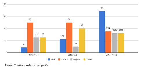 Es el resultado del nivel del estrés según año de residencia, que la mayoría presenta un nivel de “Estrés Medio” con 31 respuestas (69 %) de los cuales, 11 (35,50%) son Residentes de primer año, 10 (32,25%) de segundo año, y 10 (32,25%) de tercer año. Seguidamente un (22%) presentan “Estrés Leve” con 10 respuestas en total, donde 5 (50 %) son Residentes de primer año, 1 (10%) de segundo año, y 4 (40%) de tercer año. Finalmente, con 4 respuestas (9 %) representan “Sin Estrés”, de los cuales, 2 (50%) son Residentes de primer año, 1 (25%) de segundo año, y 1 (25%) de tercer año.