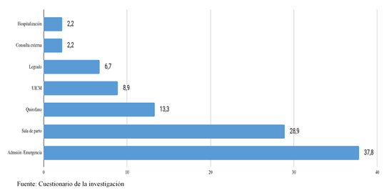 Se observa que en el ítem Admisión/Emergencia con una frecuencia de 17 respuestas (37,8 %), es el área con mayor presencia de factores estresantes, seguido por Sala de Partos, con una frecuencia de 13 respuestas (28,9 %) y Quirófano con 6 (13,3 %). Mientras que UCIM, con una frecuencia de 4 respuestas (8,9 %), legrado con 3 (6,7 %), consulta externa y hospitalización 1 respuesta cada uno (2,2 %) son las áreas que menos factores desencadenantes de estrés presentan para los residentes.