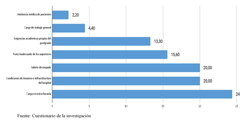 En este gráfico se observa que en el ítem “carga excesiva horaria”, con una frecuencia de 11 respuestas en la escala (24,4 %), es el mayor factor desencadenante de estrés, seguido por “condiciones de insumos e infraestructura del hospital” con una frecuencia de 9 respuestas en la escala (20 %), y “salario devengado” con una frecuencia de 9 respuestas en la escala (20%). El ítem “trato inadecuado de los superiores” obtuvo 7 respuestas (15,6 %), “exigencias académicas propias del postgrado” obtuvo 6 respuestas (13,3 %). Los ítems con menos factores desencadenantes de estrés fueron “carga de trabajo en general” con una frecuencia de 2 respuestas (4,4 %) y la “asistencia médica de pacientes” con 1 sola respuesta representando el (2,2 %).