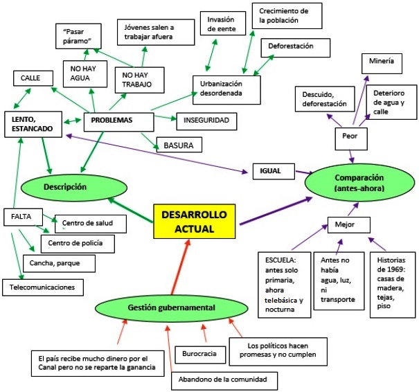 En la Figura 3 se expone la RS del desarrollo actual de Nuevo Caimitillo, en la que se identifican tres subcategorías en los elementos que la componen: la descripción, la comparación entre el momento presente y uno anterior, que para algunos parece ser su llegada a la comunidad, y por último la referencia a la gestión gubernamental. En general, el desarrollo actual es percibido como lento.