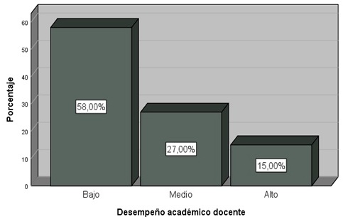 Esto significa que la mayoría de los docentes encuestados calificaron nivel bajo con 58,00% predominando más este nivel siendo este el porcentaje más alto de los tres niveles, seguido del nivel medio calificado con 27%,00 y el nivel alto tiene 15,00% del total. En donde se concluye que el desempeño académico docente se ve afectado significativamente.