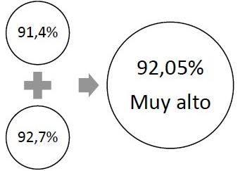 La combinación de estos dos porcentajes (91,4% y 92,7%) genera una valoración promedio muy alta del 92,05%, representada en el círculo más grande de la Figura 1. Esta valoración combinada sugiere una aceptación excepcionalmente positiva de Gimkit como herramienta educativa, tanto para el uso actual como para su implementación futura en contextos educativos (Fernández, Valladares y Alfonso, 2022a); (Curay y Ramón, 2021). La denominación “Muy alto” que acompaña al porcentaje enfatiza la fortaleza de esta evaluación positiva.