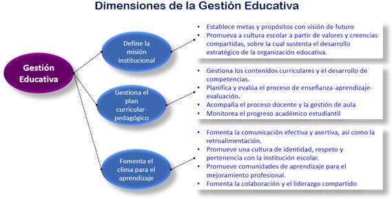 Poniendo en contexto lo planteado, se tiene que la gestión educativa en el Sistema de la Educación peruana está enmarcada en la Ley General de Educación N° 28044 y en el Marco del Buen Desempeño Directivo (MBDDir, 2014), donde se establece que el perfil de un líder de la gestión educativa, en los ámbitos pedagógico, institucional y administrativo, debe estar orientado al desarrollo de habilidades que les permita ejecutar los roles y responsabilidades educativas en un contexto democrático, garantizando la participación de la comunidad, con un objetivo común para lograr la escuela ideal. En el caso del MBDDir, se establece el modelo de gestión escolar, el cual se centra en generar un mayor impacto en la calidad de la enseñanza y del aprendizaje de los estudiantes, con la implementación de buenas prácticas para el trabajo en equipo. Esto permite que las instituciones educativas avancen hacia la gestión del cambio de los procesos pedagógicos, centrando a toda la organización en los procesos de aprendizaje (Ministerio de Educación de Perú, 2014).