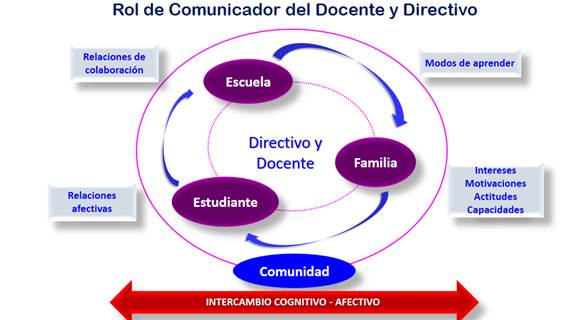 Un aspecto que destaca en la gestión educativa y el estilo de liderazgo, tanto del directivo como del docente, es la comunicación, pues es un proceso inherente a todo acto educativo. Para dar cumplimiento a las funciones docentes o directivas no es suficiente con la preparación desde el punto de vista teórico - metodológico; además debe apropiarse de un conjunto de recursos para poder combinar de manera armónica y coherente, lo instructivo con lo formativo, pues el papel de ellos trasciende lo meramente cognitivo relacionado con la transmisión de información y conocimientos, para llegar hasta lo afectivo que integra y desarrolla sentimientos, convicciones, valores, motivaciones y actitudes, de ahí su connotación social (ver Figura 6).