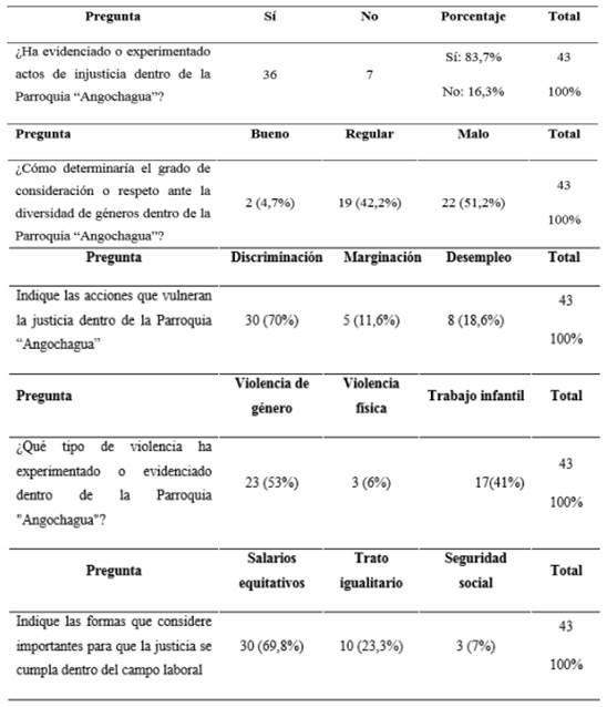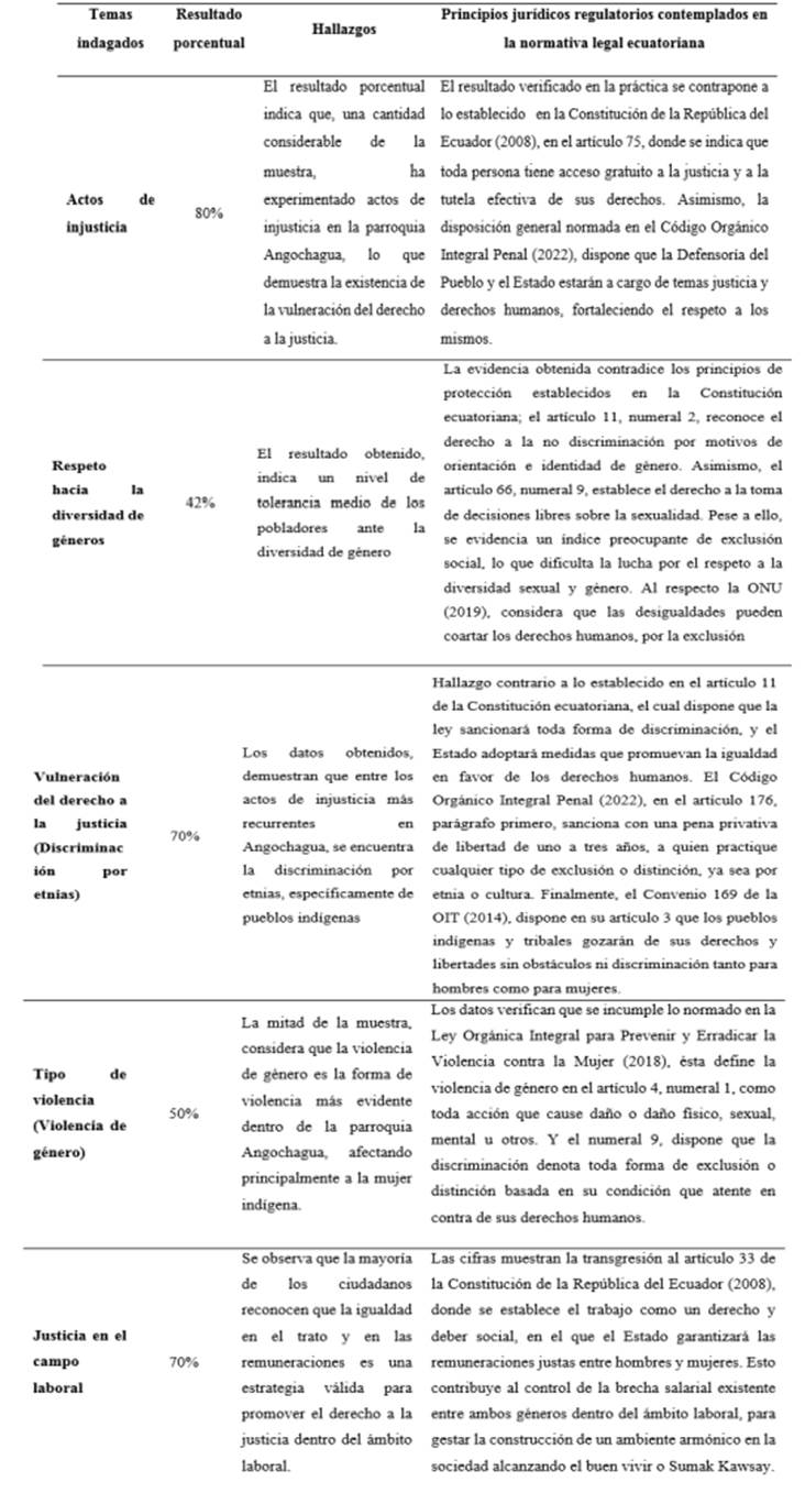 En cuanto a los hallazgos obtenidos de la encuesta, se puede precisar que en la Parroquia “Angochagua” hay injusticias debido a la discriminación por diversidad de género, por pertenecer a etnias minoritarias y un retardo procesal que limita los derechos ciudadanos. Lo cual pone de relieve que en esta comunidad hay una situación compleja que hace peligrar la estabilidad del orden público, al respecto señala Solís (2017) que “al mantener a ciertas personas fuera de diversos espacios, la discriminación no sólo ocasiona asimetrías entre individuos, conocida como desigualdad vertical, sino también entre grupos sociales o desigualdad horizontal” (p.7). De igual forma, la Declaración de los Derechos Humanos, en su preámbulo menciona entre sus considerandos que, la libertad, la justicia y la paz en el mundo tienen por base el reconocimiento de la dignidad intrínseca y de los derechos iguales e inalienables de todos los miembros de la familia humana, este es reconocido y considerado importante para Viteri (2019)), en su artículo “Violencia, géneros y derechos en el territorio”.