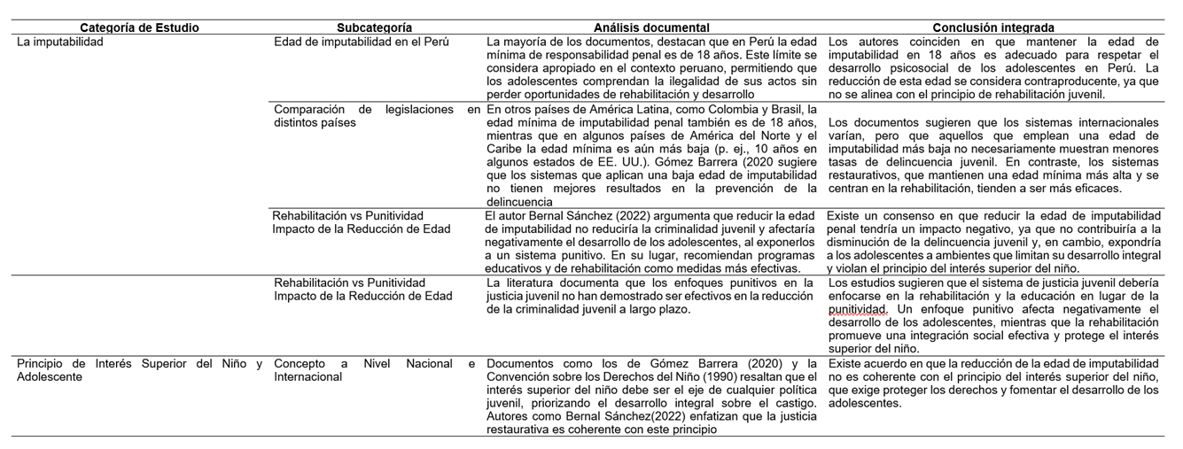 En el Perú, la Ley 30466 (Presidente del Congreso de la República, 2016), establece que los adolescentes entre 14 y 18 años son inimputables bajo el Código Penal, pero pueden ser responsables en un sistema juvenil especializado que prioriza su rehabilitación. Este marco legal se alinea con estándares internacionales como la Convención sobre los Derechos del Niño. Sin embargo, su implementación enfrenta desafíos, como la falta de recursos y la limitada formación de operadores de justicia en enfoques restaurativos.