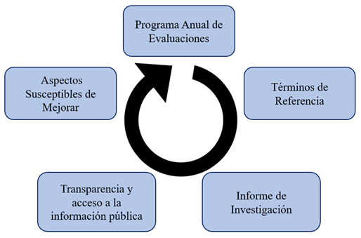 Por consiguiente, para valorar la gestión integral en las etapas descritas de la figura 1, con las técnicas de los términos de referencia emitidos por Coneval, se contrastaron métodos y resultados de la evaluación de los proyectos. En este orden la operación del sistema de seguimiento y evaluación del programa derechos humanos del Estado de México, se encuentran regulados a través de los Lineamientos para la Operación del Sistema de Seguimiento y Evaluación de la Gestión. Instrumento que tiene por objeto, de que la información de los proyectos se encuentre sistematizada para seguimiento al cumplimiento de objetivos y avances programados por la departamentalización administrativa (Codhem, 2022). Al tiempo de delimitar áreas de oportunidad, a través de precisar aspectos susceptibles a mejorar en la evaluación periódica durante un ciclo de ejercicio anual.