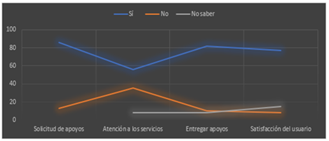 Entrega de apoyos. La recepción de las quejas se ejecutó en las Visitadurías Generales y Adjuntas que se ubican en diferentes lugares del Estado de México, así como en la Unidad de Orientación y Recepción de Queja de la oficina sede. De la aplicación de encuestas se refirió lo siguiente: el 82 % indicaron que la entrega de apoyos es de fácil acceso a la ciudadanía toda vez que las unidades administrativas que las otorgan son oportunas, mientras que el 10 % dijeron que no y el ocho % expresaron no saber.