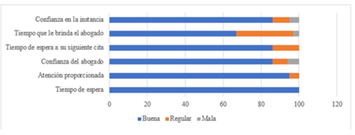 El 100 % de los encuestados refirieron que el tiempo de espera máximo es de media hora, estimaron razonable para la atención que se requiere. El 95 % de los encuestados destacaron que la atención recibida fue buena y el cinco % manifestaron una atención regular. Así mismo, el 91 % consideran que el área en la que recibieron atención se encuentra en condiciones aceptables y el cinco % en condiciones regulares. Un 96 % de encuestados comentaron que el grado de amabilidad, respeto y paciencia del abogado de guardia para la atención de sus asuntos es bueno y sólo el seis % evaluaron que es regular. El 86 % mencionaron que la atención brindada es buena; sin embargo, un 11 % señalaron que es regular y el tres % mala. Para el grado de confianza sobre el abogado de guardia el 86 % reconocieron que es buena, un ocho % regular y un seis % mala.