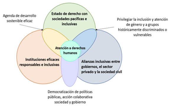 Los postulados universales de paz, derechos humanos y gobernabilidad en el Estado de Derecho con sociedades pacíficas facilitan la justicia para sus habitantes. En otros términos, contar con instituciones eficaces responsables e inclusivas, como lo establece el Objetivo de Desarrollo Sostenible (ODS) 16 de la Agenda 2030 (NU, 2015). Por lo anterior, se requiere esquematizar un programa de desarrollo sostenible eficaz, de alianzas colaborativas entre ámbitos gobiernos, el sector privado y la sociedad civil. Estas sean construidas sobre principios y valores, una visión que se comparta y objetivos para la colectividad con prioridad a las personas tal y como se señala en el ODS 17. La intervención de la sociedad civil en la democratización de las políticas públicas, como construcciones participativas tienden a resolver un problema específico de manera comunal.