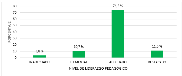 En los cuatro niveles del liderazgo pedagógico (ver Figura 1), se detallan las percepciones de la muestra: 74.2% responde que, en su institución educativa, el liderazgo pedagógico que ejercen los directivos está en nivel adecuado; un 11.3% responde que está en un nivel destacado; un 10.7% indica que está en un nivel elemental; y, un 3.8% señala que está en un nivel inadecuado. La mayoría de la muestra se orientó a ubicar el Liderazgo Pedagógico de los directivos en el Nivel adecuado.