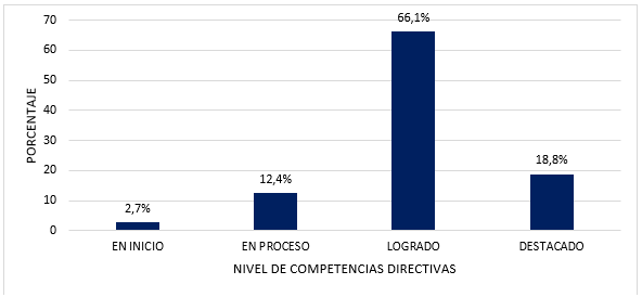 En los cuatro niveles de las competencias directivas (ver Figura 2), se detallan las percepciones de la muestra: 66.1% responde que, en su institución educativa, se desarrolló en los directivos en un nivel de logrado; un 18.8% responde que está en un nivel destacado; un 12.4% indica que está en un nivel de proceso; y, un 2.7% señala que está en un nivel en inicio. La mayoría de la muestra se orientó al Nivel logrado en relación con la variable Competencias directivas.