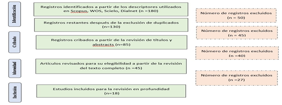 La técnica utilizada fue el análisis documental porque implica un proceso de revisión de documentos originales y relevantes para extraer datos esenciales y fundamentar las conclusiones del estudio (Arias et al., 2022). La herramienta que permitió intervenir fuentes documentales fue la metodología PRISMA (Preferred Reporting Items for Systematic Reviews and Meta-Analyses) comúnmente empleada en la realización de revisiones sistemáticas y metaanálisis en la investigación científica. El propósito fundamental de este método es ofrecer un marco organizado y claro para llevar a cabo revisiones sistemáticas, asegurando la correcta inclusión de estudios pertinentes y la presentación transparente de los resultados obtenidos (Moher et al., 2009). El análisis del proceso de revisión sistemática que se utilizó en esta investigación consta de diferentes fases: desarrollo de la pregunta de investigación, criterio de elegibilidad, estrategias de búsqueda, selección y la codificación de datos (Buntins et al., 2019).