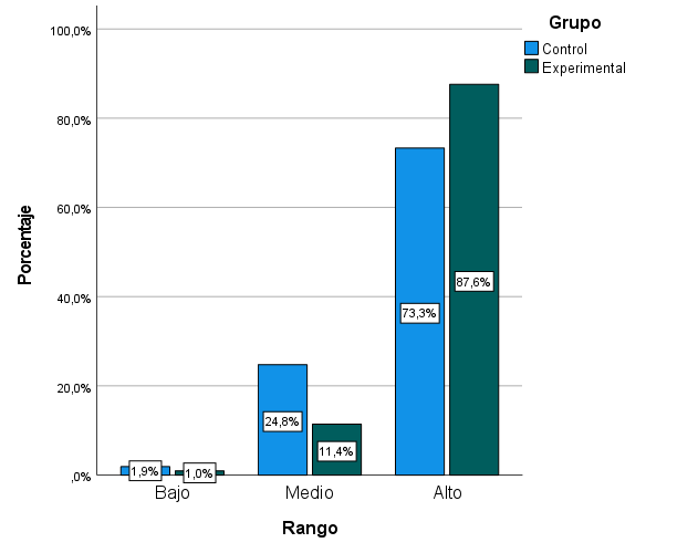En los hallazgos derivados, los resultados indican una diferencia significativa entre los procesos de los grupos, donde el grupo experimental muestra resultados favorables en los avances para la resolución de problemas, superan gradualmente sus deficiencias y demuestran adquisición de habilidades para los procesos matemáticos, mientras el grupo control se mantiene por debajo, lo cual evidencia la falta de acompañamiento en el proceso, a continuación, los datos han sido organizados en una tabla cruzada que muestra la relación entre el rango de habilidad (Bajo, Medio y Alto) y los dos grupos mencionados tal y como lo muestra la Figura 1 a continuación.