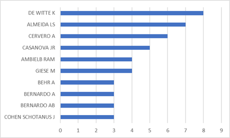 La Figura 3, muestra la cantidad de publicaciones realizadas por diferentes autores. Dentro de la lista de autores, se observa a De Witte (2020), como el que encabeza la lista con la mayor cantidad de publicaciones 8, seguido por Almeida (2020), con 7; luego se tiene a Cervero (2020) con 6, Casanova (2020) con 5, además se encontró a Ambielb (2020) y Giese (2020) con 4; otros autores con 3 publicaciones. La mayoría de ellos tienen una frecuencia uniforme de 1 a 2 publicaciones por año.