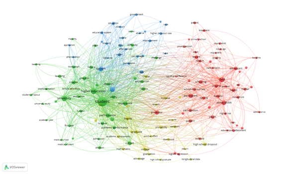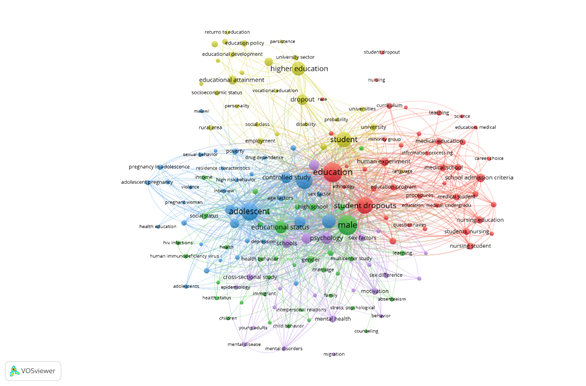 En cuanto a los nodos de color Azul, se muestran términos como "adolescentes", "embarazo" y "estatus socioeconómico". Este clúster aborda temas relacionados con salud pública, al igual que comportamiento social en adolescentes. De igual manera, los nodos de color Verde agrupan conceptos como "educación superior", "tasas de abandono escolar", "estatus educativo", indicando enfoques en el impacto de la educación en el desarrollo social. Por ultimo los nodos Amarillos, muestran lo relacionado con "motivación", "psicología", "factores de género", sugiriendo estudios en psicología educativa y motivación. En esta Figura 4, se identifica áreas interdisciplinarias claves, destacándose la interacción entre educación, salud y factores psicológicos. Se resalta el enfoque en temas de equidad educativa, abandono escolar, formación médica, lo que puede orientar futuras investigaciones a abordar desigualdades que mejoran intervenciones educativas. Este mapa de co-ocurrencias es útil para visualizar tendencias temáticas, relaciones importantes en investigaciones científicas, permitiendo a los investigadores identificar vacíos en el conocimiento de posibles áreas de colaboración interdisciplinaria.