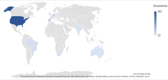 La Figura 6, muestra un mapa mundial que representa la distribución geográfica de publicaciones, indica que Estados Unidos lidera la producción científica sobre deserción universitaria, con 161 documentos publicados. Este dominio puede atribuirse a la importancia de la retención estudiantil en el sistema educativo estadounidense y a la disponibilidad de financiamiento para investigaciones en este ámbito. Otros países con menor producción pueden enfrentar limitaciones en términos de acceso a bases de datos académicas y financiamiento para investigaciones longitudinales sobre educación superior.