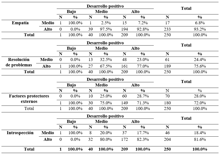La Tabla 1 expuso la interacción entre las dimensiones de la resiliencia y el desarrollo positivo. En el caso de la empatía, 233 (93.2%) estudiantes reflejaron un nivel alto y 17 (6.8%) nivel bajo. Sobre la resolución de problemas, se percibieron niveles alto 189 (75.6%) y medio 61% (24.4%). Referente a los factores protectores externos, se tuvieron niveles bajo (70 - 28%) y medio (180 - 72%). Asimismo, en introspección se alcanzaron niveles medio (46 - 18.4%) y alto (204 - 81.6%). Por lo tanto, la muestra reflejó niveles de empatía e introspección considerables. Asimismo, mediante la reflexión y autoconocimiento pudieron salir de la zona de confort y aplicar estrategias psico - cognitivas en su socialización y emprendimiento personal. Por tanto, se emprendieron acciones en beneficio de su progreso y sostenibilidad.