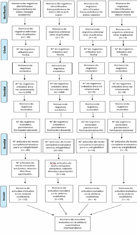De acuerdo con la tabla anterior, la principal fuente de información se concentra en Google Academic, lo que implicó un mayor número de revisiones, realizadas con rigurosidad y detalle, en condiciones semejantes a lo observado en la base de datos Research Gate, que igualmente ofrece una considerable cantidad de resultados y, en consecuencia, diversos momentos de revisión. En contraste, Dialnet y SciElo presentan un volumen menor de hallazgos. En total, se identificaron 30 artículos que nutren la presente revisión sistemática.