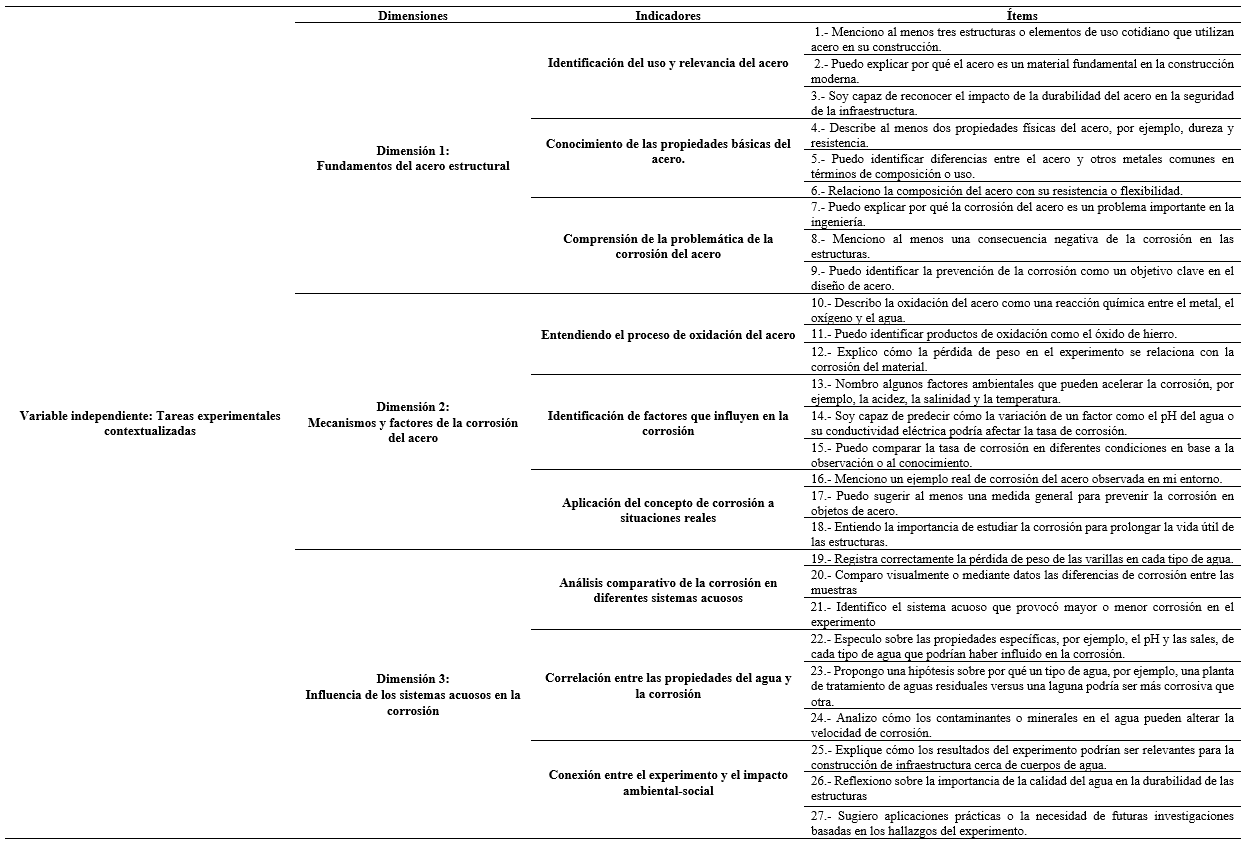 La investigación se desarrolló, siguiendo principios éticos, los participantes fueron informados acerca de los objetivos, procedimientos y la confidencialidad de sus datos, también se obtuvo el consentimiento informado por escrito de cada uno de ellos, en donde se señala la participación voluntaria. El protocolo de investigación fue revisado y aprobado por el Vicerrectorado de Investigación de la Universidad Nacional de Cajamarca. La Tabla 1 no presenta los resultados del cuestionario, evidencia la matriz de mediciones del estudio, la cual se empleó para medir la variable independiente: Tareas experimentales contextualizadas.