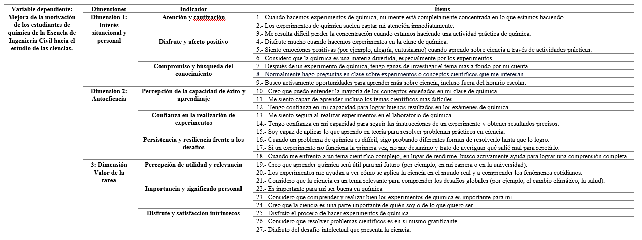 La Tabla 2 no presenta los resultados del cuestionario, evidencia la matriz de mediciones del estudio empleada para cuantificar la variable dependiente: Fortalecimiento en la Motivación de los Estudiantes de Química de la Escuela de Ingeniería Civil hacia el Estudio de las Ciencias.