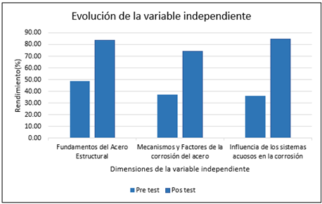 La Figura 6 muestra que, la variable independiente incrementó el conocimiento de los estudiantes sobre los contenidos fundamentales acerca del acero, lo cual es muy significativo en su formación como ingenieros civiles, Las diferencias porcentuales entre el postest y pretest en las dimensiones de fundamentos del acero estructural, mecanismos y factores de la corrosión, y la influencia de los sistemas acuosos en la corrosión fueron 28,97%, 27,78% y 28,74%, respectivamente.
