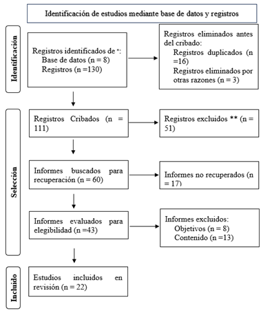 Proceso de cribado y selección de estudios: se identificaron 130 artículos sobre el uso de la técnica de gamificación en universitarios; luego de la eliminación de duplicados y aplicación de filtros, se evaluaron los títulos y resúmenes, resultando una preselección de 43 artículos. Posteriormente, se realizó la lectura y se empleó criterios de selección; resultaron 22 estudios para el análisis final (Figura 1).