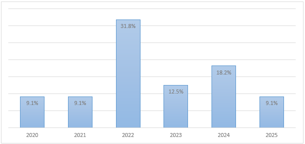 Nota. Porcentaje de distribución de los estudios seleccionados según el año de publicación, elaboración propia (2025).