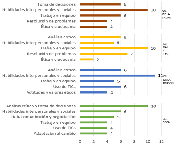 Los resultados consolidados (gráfico 1), presentan como competencias genéricas fortalecidas con el uso de juego de roles, en primer lugar a las habilidades interpersonales, sociales, trabajo en equipo, análisis crítico, toma de decisiones; no obstante, a nivel particular, en Ciencias de la Salud y en Ciencias de la Persona predominan las habilidades interpersonales, así como las habilidades sociales; en las Ciencias Básicas destacan las competencias vinculadas con el trabajo en equipo; en las Ciencias Económicas sobresalen el análisis crítico, así como la toma de decisiones. Debe considerarse que las competencias genéricas, por su propia definición, poseen relevancia para todo el estudiantado; sin embargo, la prevalencia de unas sobre otras se explica según el área científica, pues ciertas capacidades se comprenden mejor como competencias específicas asociadas a cada campo profesional. Por ejemplo, en las ciencias básicas y tecnológicas el dominio en el uso de las Tecnologías de Información y Comunicación (TIC) es inherente a su naturaleza, pero no registra como competencia genérica, porque se considera específica.