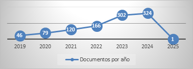 En relación con lo obtenido a través del análisis bibliométrico, comenzó con la distribución de textos por año, para observar la tendencia de publicaciones. La distribución de los documentos mostró una tendencia creciente, con una línea estable hasta 2022 y dos saltos pronunciados en 2023 y 2024, lo que sugiere un creciente interés por la temática. Además, mostró la publicación de un artículo para 2025.