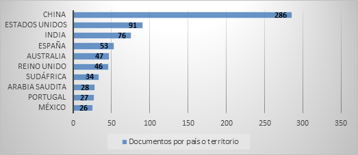 En cuanto a la relación de citas, del total de 1038 documentos publicados, más de la mitad habían recibido al menos una cita (n=572), lo cual indica que se trata de una temática relevante y con un impacto considerable. Este resultado se confirmó con el análisis del índice h y el total de citaciones, que para la base analizada fue de 36 y 8,184 respectivamente. En cuanto a la distribución geográfica, el análisis develó una tendencia hacia China y Estados Unidos como líderes mundiales (figura 2). Destaca la presencia de España, México y Portugal, que podrían promover el desarrollo de este campo en Latinoamérica a través de redes de colaboración académica y proyectos.