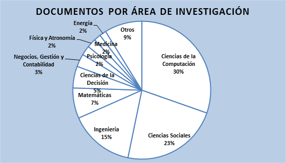 En cuanto a las disciplina o áreas según la clasificación ofrecida por Scopus, la distribución de documentos recayó fundamentalmente en tres, Ciencias de la Computación (n=639), Ciencias Sociales (n=481) e Ingenierías (319) (figura 3). Con apenas 12 campos identificados, la temática parece incipiente y todavía centrada en el desarrollo de modelos y aplicaciones. Es destacable que para la base Scopus, Educación es un subcampo de las Ciencias Sociales, sin embargo, el campo Psicología sí aparece representado con 47 publicaciones.