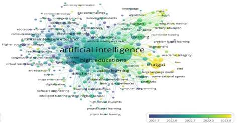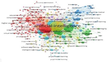 Para culminar el estudio bibliométrico se analizó la co-ocurrencia de las palabras clave establecidas por las revistas al momento de indexar. Este análisis arrojó un total de 3,675 palabras, las cuales se redujeron 259 tras la introducción del mínimo de 5. A diferencia de la unidad de análisis anterior, en esta aparecieron la enseñanza y la integración como categorías centrales, acompañando a la IA (figura 6).