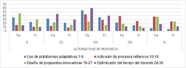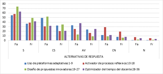 En relación con la dimensión plataformas adaptativas, los resultados sugieren la consideración del planteamiento de Otero et al. (2019), quienes resaltan que el impacto de la tecnología ha impactado en los procesos educativos, cambiado el paradigma del aprendizaje y acrecentando la necesidad del docente por diversificar su práctica y repensar el proceso de enseñanza basado en la incorporación de las tecnologías de la información y comunicación, para incrementar la efectividad y grado de significancia de las experiencias de aprendizaje haciéndolas más efectivas.
