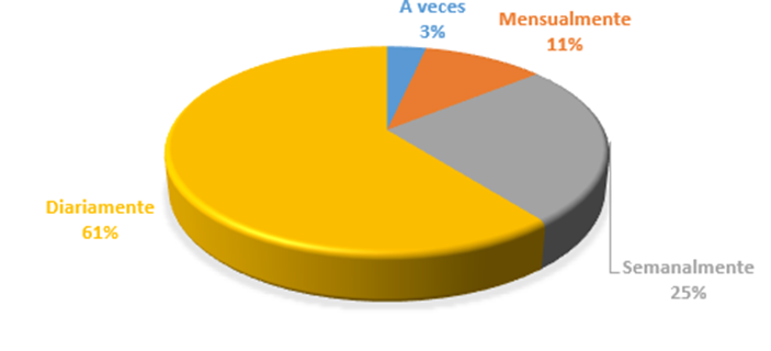 Al aplicar el cuestionario para analizar el uso de ChatGPT por los docentes universitarios como parte del desarrollo de sus actividades académicas se obtiene como resultado que: Solo el 3% utilizan “a veces” el ChatGPT, el 11% mensualmente, el 25% semanalmente y el 61% de manera diaria, tal como se muestra se muestra en la figura 1.