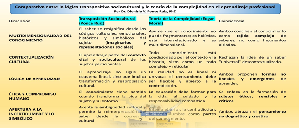 Estas tres perspectivas coinciden en afirmar que el aprendizaje no es un proceso meramente cognitivo, sino una experiencia cultural, simbólica y transformadora. Estas rechazan la neutralidad epistémica para proponer un sujeto que aprende desde su cuerpo, su historia, su comunidad y sus emociones. Al integrar estos enfoques, se fortalece una visión de la educación como práctica de libertad (Freire), de complejidad (Morin) y de transposición creativa (Ponce Ruiz).