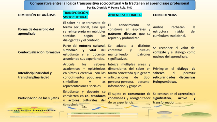 En lo concerniente a la transposición sociocultural, propuesta por Dionisio Vitalio Ponce Ruiz, en el año 2011, en su disertación doctoral, constituye una postura emergente que reconoce al diálogo cultural y a los imaginarios socioculturales, como elementos esenciales del aprendizaje. Desde su perspectiva cultural, esta modelación teórica- metodológica, nace de una asunción hibrida de los procesos transculturales, que fueron delineados en un antecedente fundamental encontrado en la obra “Contrapunteo del Tabaco y el azúcar” de Fernando Ortiz.
