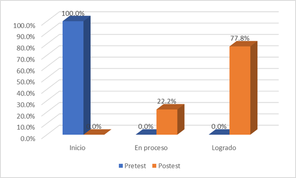Según la figura 1, de acuerdo a los resultados obtenidos, se observó que todos los estudiantes se encontraban en el nivel inicial. Sin embargo, al final, el 22% alcanzó el nivel de proceso, mientras que el 77.8% logró alcanzar el nivel de logro esperado. A pesar de este progreso, es crucial continuar monitoreando su evolución para garantizar que mantengan el nivel alcanzado.